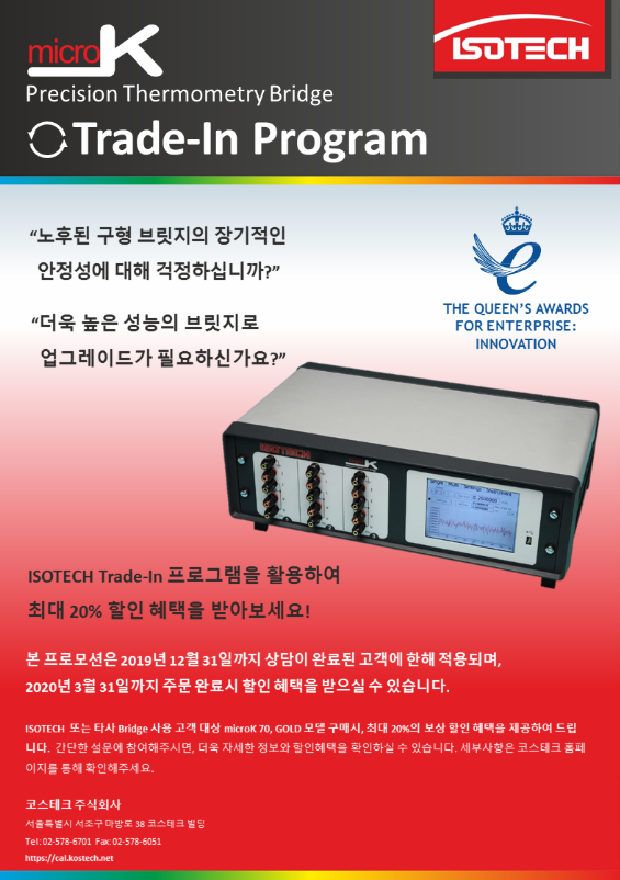 ISOTEH microK Trade-In 프로그램을 이용하여 사용중인 온도 브릿지를 업그레이드 하고 최대 20% 할인혜택을 받아보실 수 있습니다.