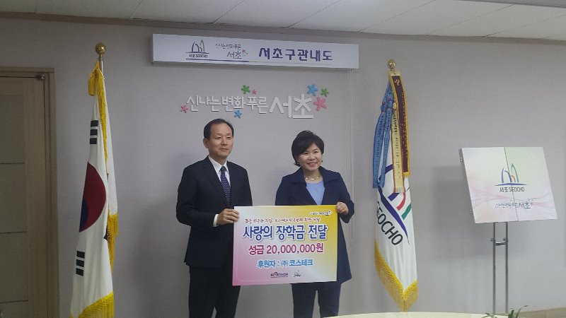 그 일환으로 2012년부터 "에코 봉사단"과 "낙전 모으기"를 통해 기업의 사회공헌활동을 지속적으로 실천하고 있으며, 2017년도에는 4회차 사랑의 장학금 2,000만원을 함께 모금하여 서초구청의 추천을 받은 12명의 학생에게 전달하는 기회를 통해 나눔을 실천하는 시간을 가질 수 있었습니다.