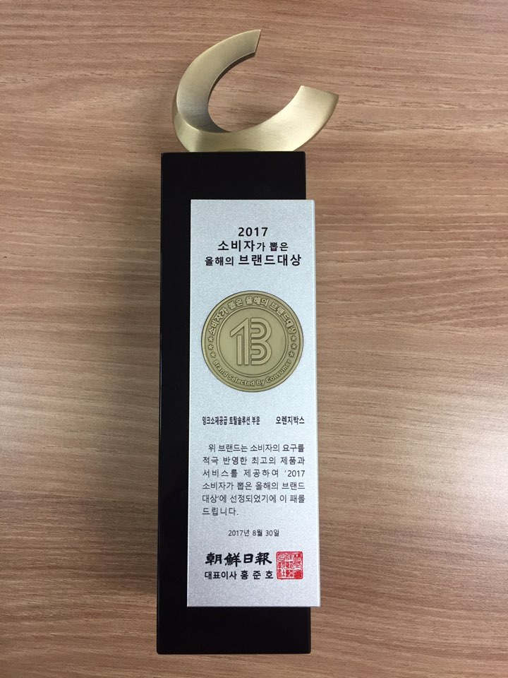 지난 8월 30일 코스테크(주)의 소재, 잉크 전문 브랜드인 오렌지박스가 2017 소비자가 뽑은 올해의 브랜드대상을 수상하였습니다.