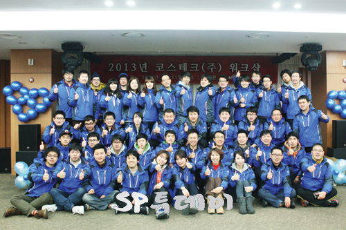 코스테크 전 임직원이 2013년 신년 워크숍에서 ‘새해에도 넘버원’의 각오를 다지며 엄지손가락을 들어보이고 있다.