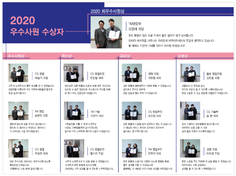 2019년도 코스테크를 빛내주신 직원분들께 수상과 함께 감사의 말씀 드립니다.
